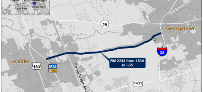 Leander is one of the fastest growing cities in Texas, so it shouldn’t come as a surprise that one of it’s main thoroughfares, RM 2243, may be set for a big expansion. The Texas Department of Transportation (TxDOT) is looking at adding three main lanes and three frontage lanes in each direction on RM 2243, also known as Leander Road, from 183A Toll Road to the Southwest Bypass in nearby Georgetown. From Southwest Bypass to I-35, RM 2243 would become a four-lane divided road. The project would also add a continuous bike and pedestrian shared use path along the entirety of Rm 2243. Currently, RM 2243 is mostly a two-lane divided highway, struggling from heavy traffic caused by a quickly growing population.