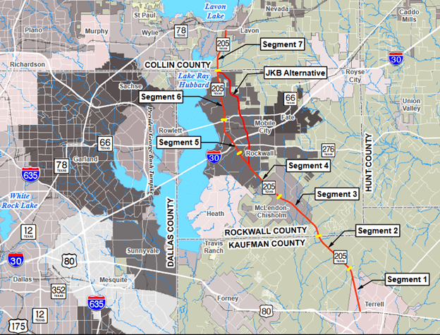 TxDOT is planning major expansions to SH 205 which are set to affect hundreds of landowner in Collin, Rockwall, and Kaufman Counties. The expansions to SH 205 will span from US 80 to SH 78, roughly 25 miles, and is split into 7 segments. To accommodate the increasing traffic in Rockwall County, the expansions include changing the part of the two-lane highway to a six-lane and replacing two bridges.