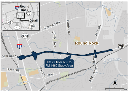 TxDOT is working on a new project to make improvements to US 79 between I-35 and east of FM 1460 (A.W. Grimes), with the goals of improving traffic flow and increasing safety for travelers in Round Rock. The proposed project includes installing a raised median for safety and widening the existing US 79 roadway by adding a third travel lane in each direction. Additional improvements could potentially include building new overpasses at US 79/Mays Street and US 79/FM 1460, and altering the existing US 79/I-35 intersection.