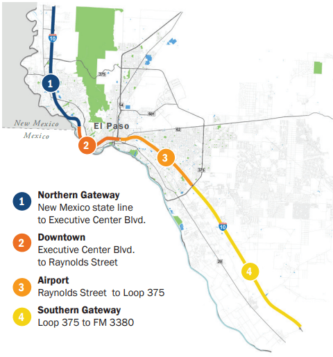 At this point in the Reimagine I-10 project, TxDOT has only prioritized improvements to Segment 2 which runs through downtown El Paso. The proposed Downtown I-10 project extends for 5.6 miles from Executive Center Boulevard to Loop 478 (Copia Street). The proposed improvements include reconstruction of the main lines, retaining walls, bridges, ramps, and cross streets. The project is anticipated to get environmental approval by 2024, which would be followed by ROW acquisitions and finally, construction.