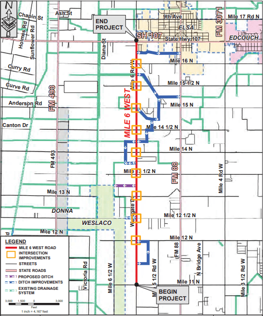 Hidalgo County Precinct #1 and TxDOT are collaborating to make improvements to Mile 6 West Road. The project spans 5.18 miles from Mile 11 to SH 107 between the cities of Weslaco and Elsa. The improvements include reconstructing the road, constructing left turn lanes and a drainage ditch, and improving existing drainage ditches. TxDOT is planning to acquire 58.1 acres of new right-of-way for the project. TxDOT anticipates ROW acquisitions to begin in the fall of 2021 after final environmental clearance is received.