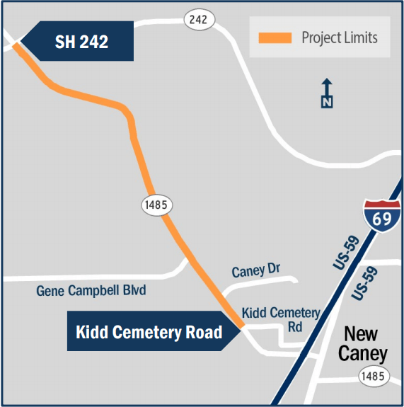 In order to improve safety and mobility, TxDOT is planning on making road improvements in Montgomery county. The 5 mile corridor of FM 1485 corridor between SH 242 and Kidd Cemetery Road is going to be widened from a two lane road to a four lane road. Additional improvements include separating the opposing lanes of traffic with a raised median and the construction of a new, 10-foot side path for pedestrians.
