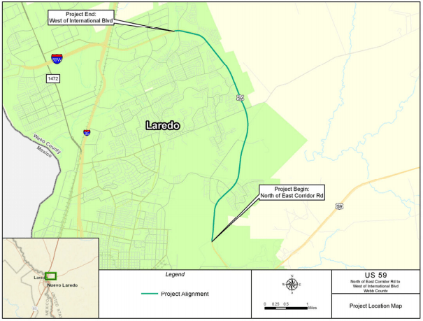 In April 2021, TxDOT advised the public that the draft environmental assessment had been released for the US 59 project in Webb County. The project is approximately 5.9 miles in length and spans from International Boulevard to East Corridor Road. The improvements will transform the roadway into an urban interstate expressway, with three 12-foot lanes in each direction, a center concrete barrier, shoulders and on/off ramps. Additional improvements will include eight storm water detention ponds and sidewalks. The project will require the acquisition of approximately 192 acres of new right-of-way and could potentially displace two commercial properties. Before acquiring ROW, TxDOT must receive final environmental clearance. Project construction will be conducted in two phases, the first of which is estimated to begin letting in September 2022.