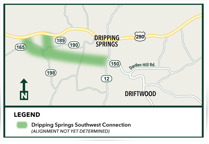 The Dripping Springs Southwest Connection is a project studying possible routes to extend the RM 150 Corridor from RM 12 around the Southwest side of Dripping Springs to connect to US 290. The project includes a four land divided road with a median in the middle.  It would also include a facility for pedestrians and biking. The exact length and constructing details will be identified in a future design phase. The right of way needed will be approximately 150 feet, exact dimensions will be determined by the final design.
