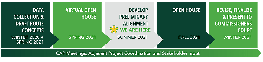 The route concept follows property lines and will impact several land owners with takings and possible relocations. The Texas Department of Transportation (TxDOT) is currently in the process of developing a precise preliminary schematic that will be revealed to the public at its next open house this fall.