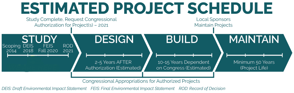 The official Coastal Texas Study website states that “impacts to homes and businesses will be avoided and minimized as much as possible during refinement and optimization of the alignments…voluntary relocations and acquisitions will be pursued, and eminent domain would only be imposed by a local sponsor as a last resort” (Texas Coastal Study, 2021). The Feasibility Report and Environmental Impact Statement (EIS) are being finalized and will be released to the public and submitted to Congress for authorization, funding, and construction in September.