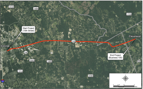The Texas Department of Transportation (TxDOT) has proposed to reconstruct and widen State Highway (SH) 105 from 10th Street in Conroe to Business 105 in Montgomery, San Jacinto and Liberty counties. The total project cost is estimated to be $175 million and is State and federally funded. The existing SH 105 consists of (generally) a two-lane undivided roadway with 11-foot outside shoulders. The proposed project would include widening to a four-land roadway with a continuous turn land, constructing pedestrian and bicyclist accommodations, and converting the open ditch to curb-and-gutter. The improvements would require approximately 45 acres of additional right of way (ROW). According to TxDOT, displacements of businesses and residences are anticipated. ROW acquisition is currently underway.