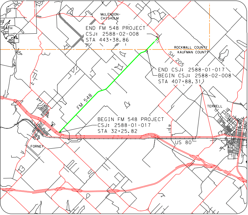 The Texas Department of Transportation (TxDOT) has proposed a widening and reconstruction of FM 548 within Kaufmann and Rockwall counties. The overall project has been divided into two segments. Segment 1 would expand the current two-lane roadway to a six-lane divided urban minor arterial from US 80 to Windmill Farms Boulevard, and segment 2 would expand the current two-lane rural roadway to a four-lane divided urban arterial (six-lane ultimate) from Windmill Farms Boulevard to SH 205. The existing right-of-way (ROW) width is approximately 100 feet wide while the proposed ROW width is approximately 122 feet wide. The improvements would require approximately 63.4 acres of new ROW and 8.01 acres of proposed permanent drainage easement. According to TxDOT, one vacant non-residential structure will potentially be displaced. It is estimated that an approximate 115 parcels are to be affected by condemnation. Right of way acquisition is currently underway with construction anticipated to begin in March of 2025.