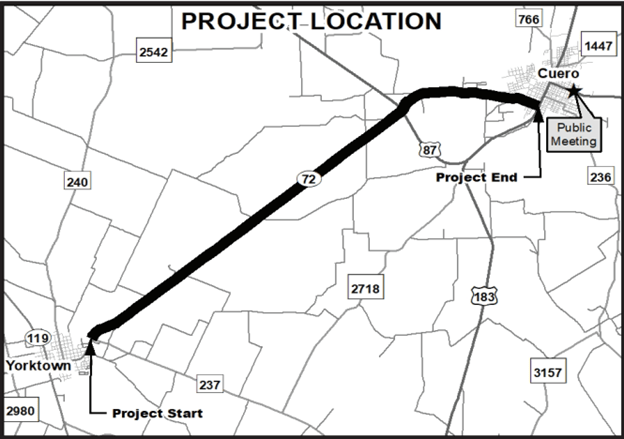 The Texas Department of Transportation (TxDOT) is proposing to widen and reconstruct State Highway (SH) 72 from Farm-to-Market (FM) 237 to United States Highway (US) 87 in DeWitt County. The improvements include one 12-foot-wide lane in each direction, a 4-foot-wide flush median between oncoming lanes, and 10-foot-wide shoulders.