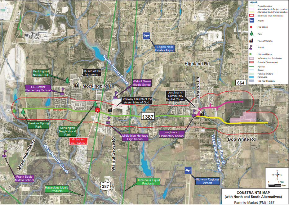 The Texas Department of Transportation (TxDOT) plans to expand FM 1387 from North Midlothian Parkway to FM 664 in Ellis County. The existing right of way (ROW) varies from 80 ft. to 100 ft. wide while the proposed ROW varies from 125 ft. to 140 ft. wide. It is estimated that an approximate 200 parcels will be affected by this ROW expansion.  According to the project’s timeline released at its second public meeting in September 2020, the project recently received environmental clearance, and is currently obtaining the necessary right of way.