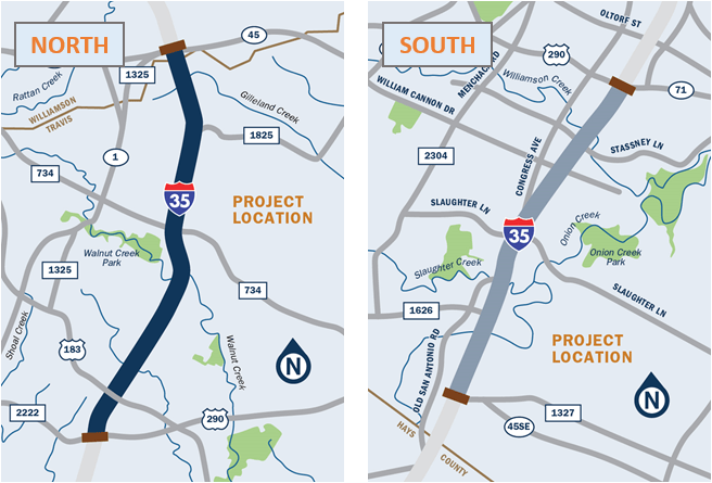 The Texas Department of Transportation (TxDOT) of Austin will be making improvements to 28 miles of Interstate 35 from SH 45 North to SH 45 southeast though an on-going project known as the I-35 Capital Express Program. It is made up of three stand-alone projects – North, Central and South. The Central project is on a later time frame, while the North and South projects are generally ahead, and on the same timeline.