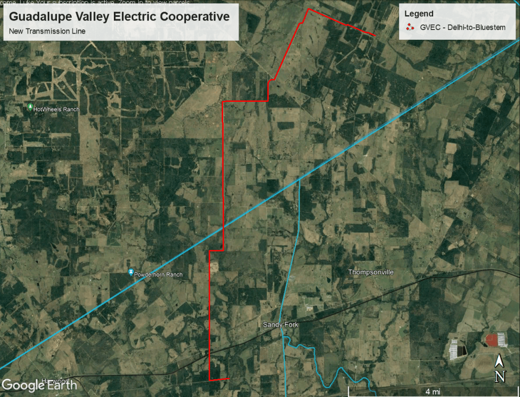 Guadalupe Valley Electric Cooperative, Inc. (GVEC), an electric utility company in Gonzales, Texas, plans to construct a 138 kilovolt (kV) transmission line in Caldwell County and Gonzales County, Texas known as the Delhi-to-Bluestem 138-kV Transmission Line Project.  In May 2020, GVEC filed an application the Public Utility Commission for an amendment to its Certificate of Convenience and Necessity (CCN) requesting approval for this project. In July 2020, the Commission administrative judge found the application sufficient. The project’s right-of-way would be 80 ft. wide, and stretch 13 miles in length starting from Wolf Run Road in Caldwell County to County Road 437 in Gonzales County. According to the timeline provided in GVEC’s approved PUC application, right-of-way acquisition is underway, and construction is on track to begin sometime later this year.