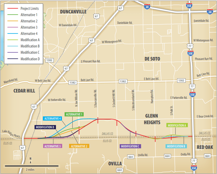 The Texas Department of Transportation (TxDOT), through a project known as the Loop 9 Segment A project (CSJ: 2964-10-006), has plans to create a direct east west link between US 67 and IH 35E through Dallas and Ellis counties. The ultimate plan for the project is the construction of a six-lane new frontage road system across the projects 9.4 miles in length. The new location frontage road system would include an eastbound and westbound frontage road facility, each consisting of three 12-foot lanes, an 8-foot inside shoulder, and an 8-foot outside shoulder for bicycle accommodations within the rural section of the proposed roadway, all of which would require new right-of-way (ROW). However after consideration of the limited funding, TxDOT has split the project into two phases; phase 1 would construct a single two-lane, two-way frontage road, and phase 2 would construct the other side of the paired frontage road (if and when funding becomes available).
