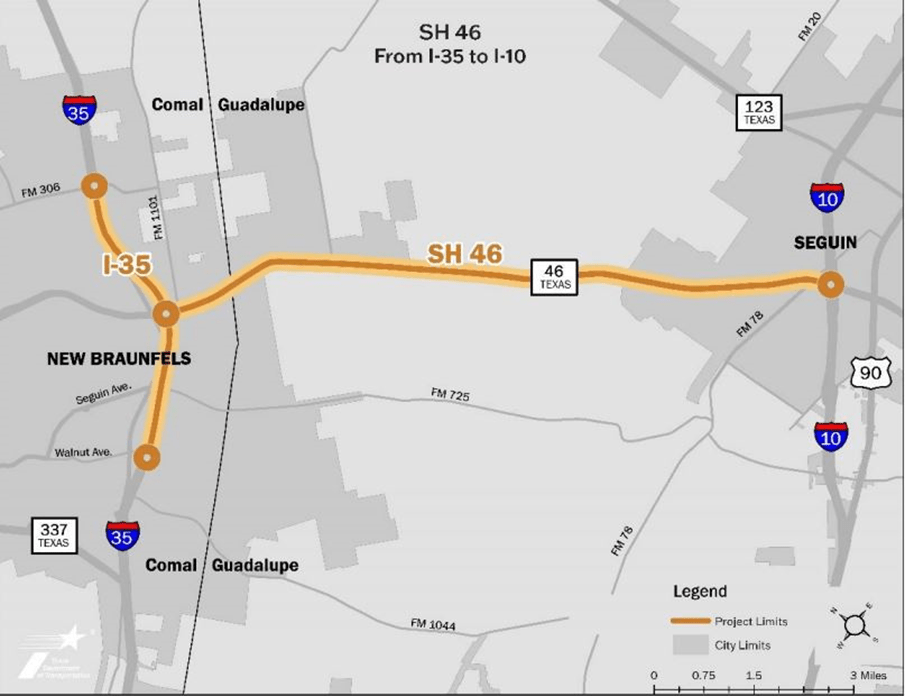 The Texas Department of Transportation (TxDOT) is proposing to improve SH 46 from I-35 to I-10 and I-35 from South Walnut Avenue to FM 306 in Comal and Guadalupe counties, Texas. Due to current and future traffic volumes and regional population growth, the proposed project’s goal is to reduce congestion, improve mobility and increase safety along SH 46.