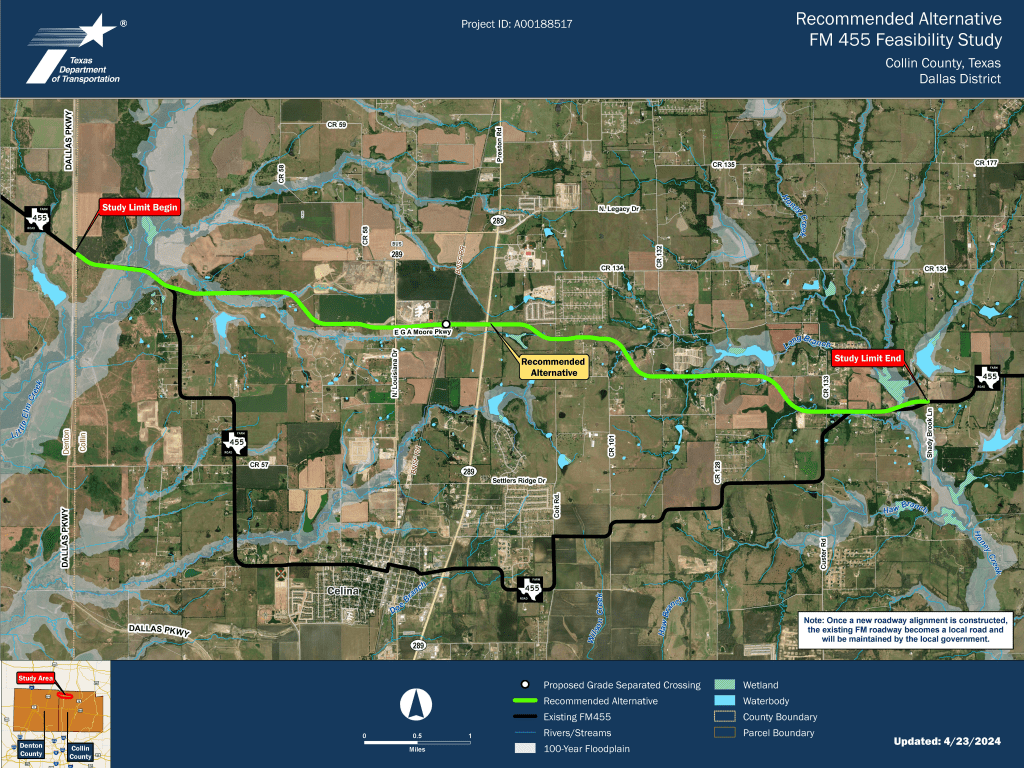 TxDOT states that it opted for a proposed alternative FM 455 route because expanding the existing ROW does not offer flexible expansion prospects and would condemn a larger volume of properties than that of the new route. TxDOT completed its feasibility study in summer 2024. TxDOT’s next steps are determined by the schematic and environmental project phase, where TxDOT will likely also determine the new ROW.